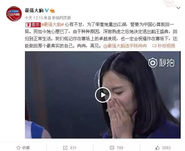 今天中午,@最强大脑发布微博:陈冉冉退出了脑王盛典,回归正常生活。