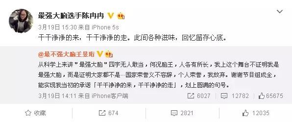 3月19日,@最强大脑选手陈冉冉 转发了@最不强大脑王昱珩的微博:干干净净的来,干干净净的走。此间各种滋味,回忆留存心底。
