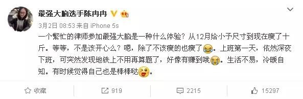 3月2日,@最强大脑选手陈冉冉:一个繁忙的律师参加最强大脑是一种什么体验?从12月给小予尺寸到现在瘦了十斤。等等,不是该开心么?嗯,除了不该瘦的也瘦了。上班第一天,依然深夜下班,可突然发现地铁上不用再算题了,好像有赚到哦。生活不易,冷暖自知。有时候觉得自己也是棒棒哒。