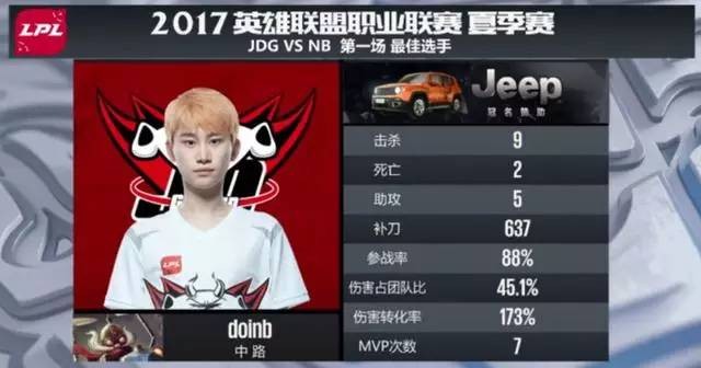 直到8.4号,两队终于再次迎来交锋。JDG战胜NB的第一局比赛中,Doinb使用英勇投弹手在49分26秒的比赛时长内拿下了637个补刀,打出9-2-5的KDA、1025.4的分均输出,并拿下MVP。可以说是用命在carry了。