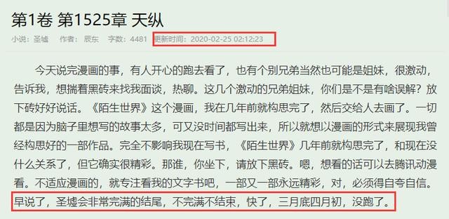 而此时,正值辰东创作《圣墟》的关键时刻,因为在此之前他曾向读者承诺,《圣墟》最迟将于2020年的3月份完结。