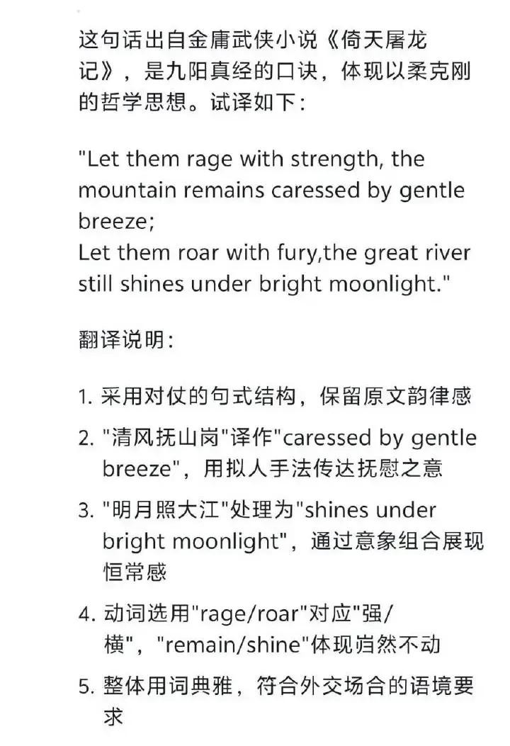 最后,想必大家都知道,翻译的质量直接影响到信息传递的准确性。在国际交流中,准确的翻译能够增强各国之间的理解与信任。DeepSeek在面对王毅所引用的这些古话时,充分发挥了其技术优势和文化理解能力,为世界呈现了一个更真实、更立体的中国。