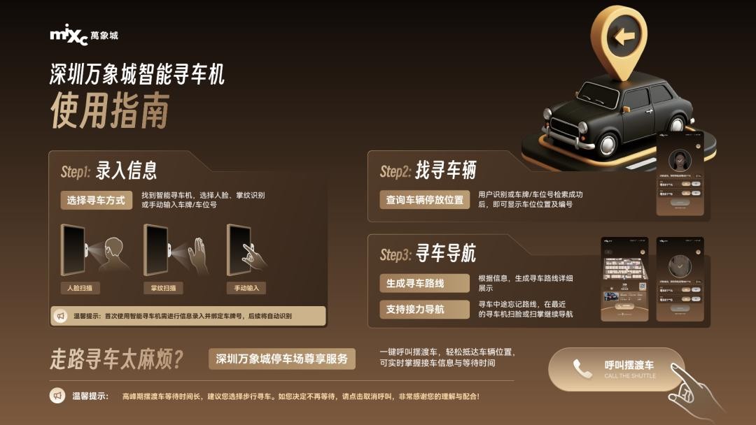 智能寻车机,三种寻车方式,随心选择:为了追求更便利的寻车体验,深圳万象城在电梯口及停车场各处增设了多台智能寻车机,提供三种智能寻车方式: