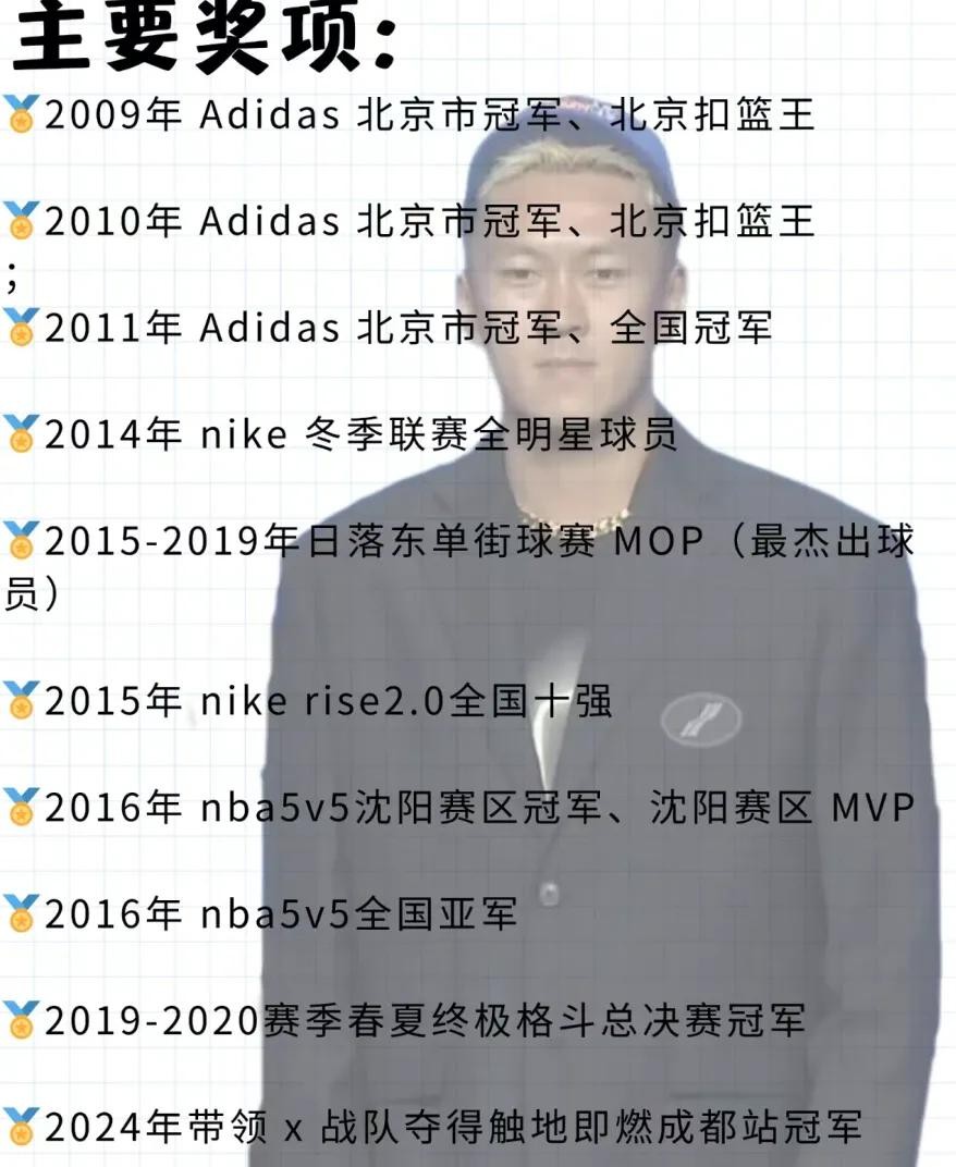 2009年那会,他还只是个十几岁的小伙子,就已经在Adidas北京市比赛中夺冠,还成了北京扣篮王!这可真是个了不起的成就。还有,2014年他成了NIKE冬季联赛全明星球员,2015年又闯入NIKErise 2.0全国十强。这些荣誉,都是他用汗水和努力换来的。