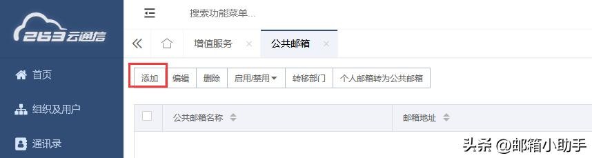 ❸点击【公共邮箱】,可以操作添加、编辑、删除、启用/禁用、转移部门、个人邮箱转为公共邮箱。
