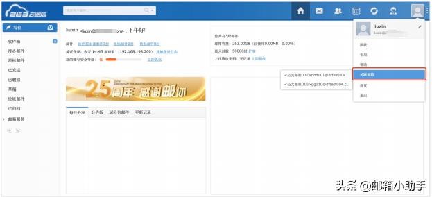 ❹关联成功后,使用成员可通过网页邮箱(地址:mail.263.net)、右上角账号、关联邮箱、一键免密登录至对应公共邮箱。客户端,使用成员可使用客户端授权码登录。