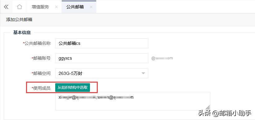 添加“公共邮箱”需要选择使用成员,编辑完成,点击保存即可(如下图所示);
