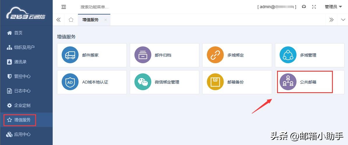 ❷在左侧菜单栏【增值服务】中,可查看【公共邮箱】功能入口(如下图所示);