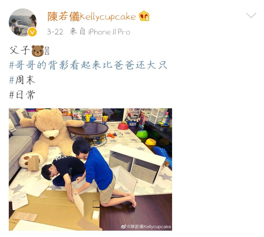 除了自拍以外,陈若仪还经常在社交平台分享林志颖和孩子的日常。3月22日,她在社交平台晒出了林志颖和kimi的合照,表示:"哥哥的背影看起来比爸爸还大只。"