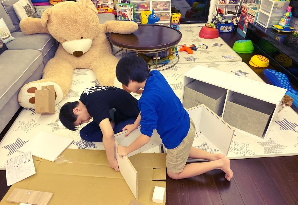 照片里林志颖穿着黑色的短袖跪坐在地上,正专心组装着一个收纳柜。kimi穿着蓝色短袖和卡其色短裤半跪在地上帮忙。客厅的地毯上处处摆放着玩具,沙发旁边还有一个超大的毛绒玩具熊,气氛十分温馨有爱。
