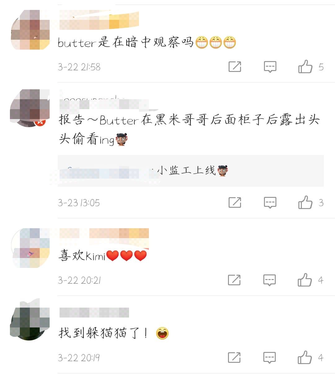 有人发现了kimi家里的小猫从收纳箱后探出了一个小脑袋,非常可爱。网友纷纷评论道:"butter是在暗中观察吗"、"报告,Butter在黑米哥哥后面柜子后露出头头偷看ing"、"小监工上线"等等。