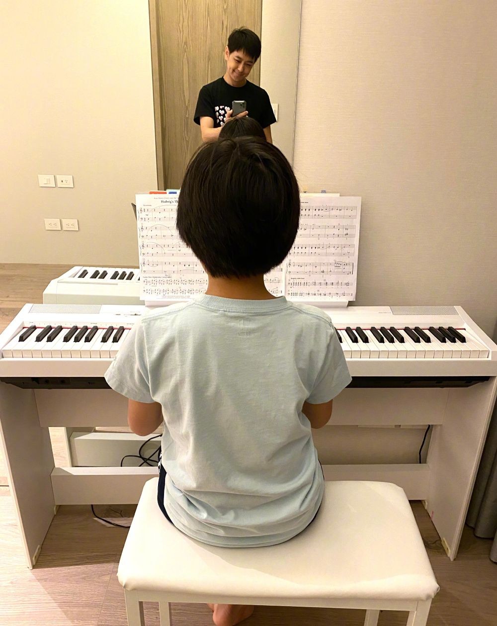 3月15日林志颖分享了一张kimi弹钢琴的背影,kimi穿着浅蓝色的短袖端正的坐在琴凳上,看起来十分乖巧,萌化了一众网友的心。