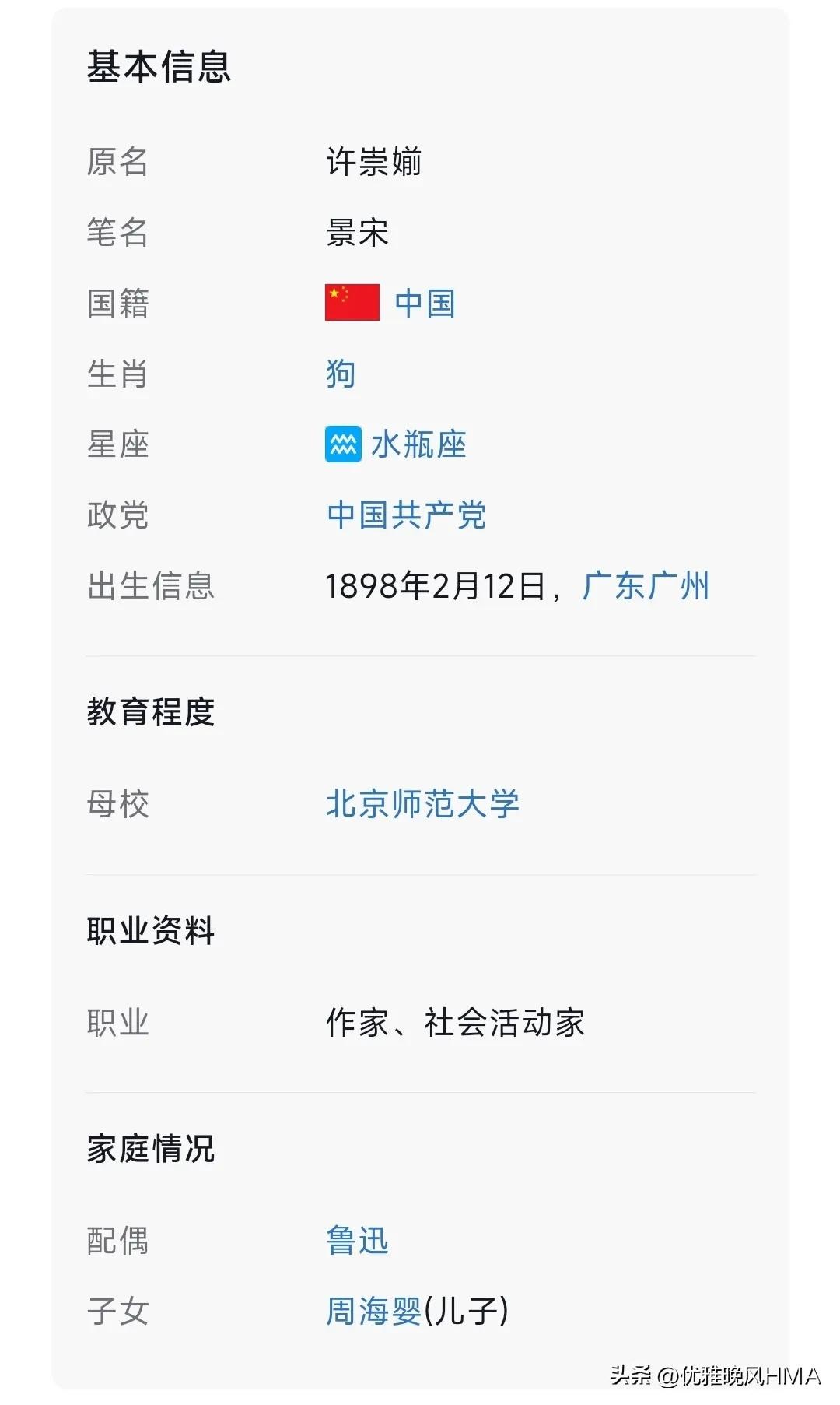 许广平(1898年2月12日-1968年3月3日),中国现代女作家,原名许崇媊,笔名景宋、归真等。广东番禺人。原为民进成员,民盟成员,晚年加入中国共产党。