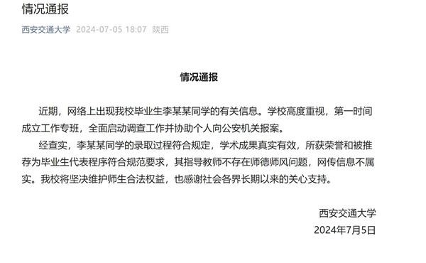 7月5日下午,西安交通大学发布通报,经查实,李艺飞同学的录取过程符合规定,学术成果真实有效,所获荣誉和被推荐为毕业生代表程序符合规范要求