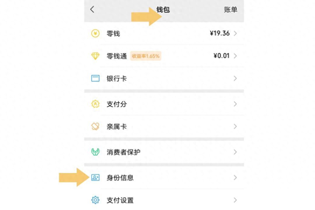 此外,如果用户想要更改微信支付的实名认证信息,可以打开微信的钱包选项,然后找到身份信息。如下图: