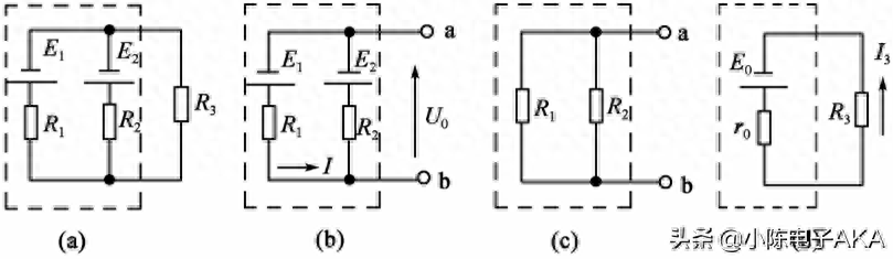 (3)将有源二端网络中所有电动势短接,变为无源二端网络,求出输入电阻r0,即为等效电源的内阻,如图例图(c)所示。