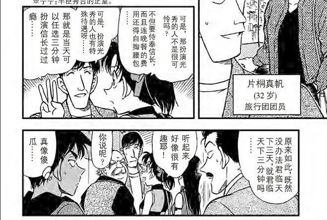 柯南一行人在游览大阪城的时候,碰巧遇到了“太阁秀吉出巡八日游”的活动,里面扮演明智光秀的人虽然要对扮演织田信长的人言听计从,但每天还是有三分钟当主人的时间。这也就是把“三日天下”的典故转化为“三分天下”,真的非常有趣。