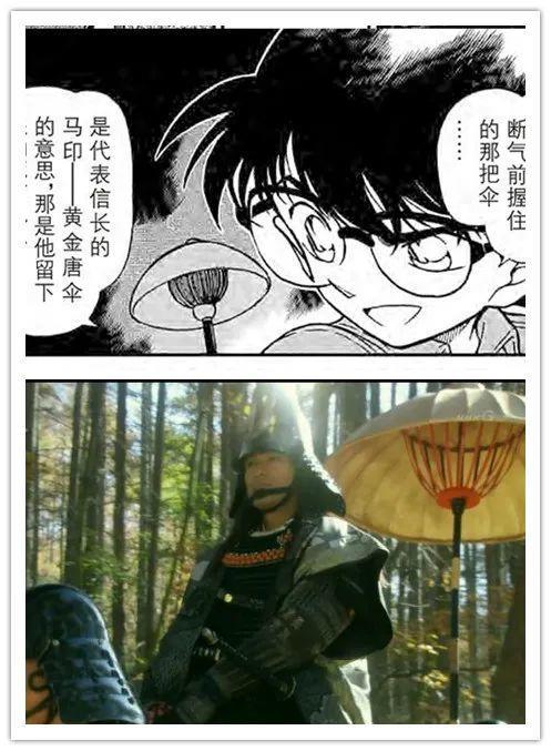 而在漫画File317-321(TV263集,拆分版282-285集)《大阪双谜 浪花剑士和太阁城》中,正是犯人抓住伞的这个细节,让平藏、柯南、平次等人联想到了信长的马印(马印,即武将为表明自己所在而在马侧或本阵中使用长柄印记。),最终推理出最后的犯人,是织田信长的扮演者。