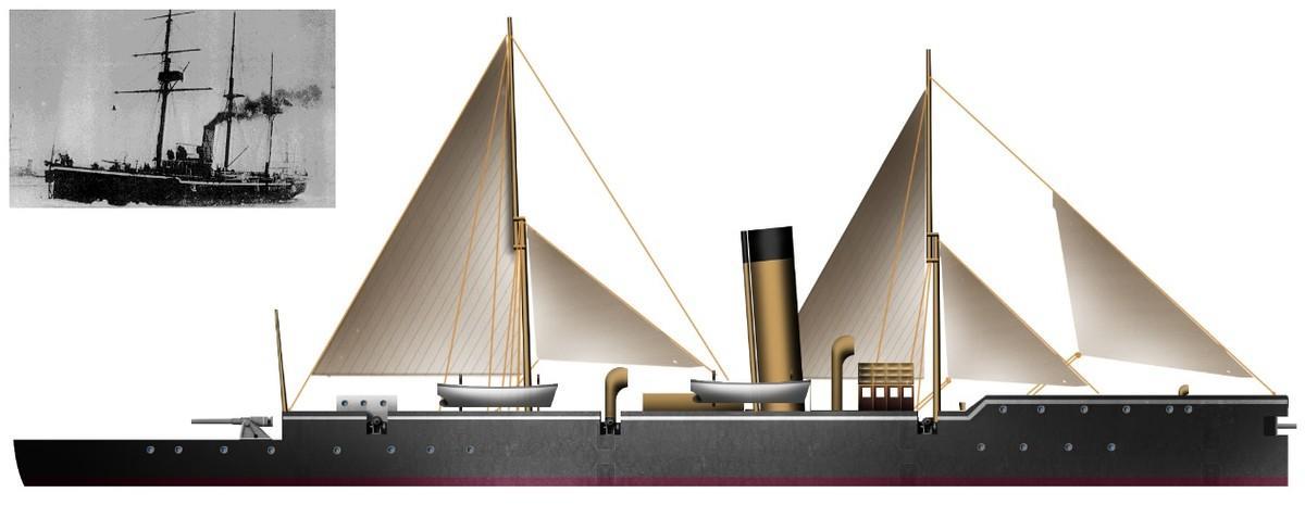 这是一艘双桅纵桁钢壳巡洋舰。至少可以说,关于这艘鲜为人知的巡洋舰的信息很少,但由于没有找到关于她的装甲保护的数据,如果有的话,康威在399页给出的名称一定是最接近事实的。什么是无保护的巡洋舰?“巡洋舰”通常被认为是一艘装备了大炮的船只,至少在19世纪80年代,它比炮船更快,装备也更重。事实上,她当时没有任何保护,而一些在弹药库和发动机上有有限的装甲,加上炮盾,使她更容易受到攻击,但也更便宜。只有一张已知的这艘船的照片,这使得这篇文章不那么突兀。
