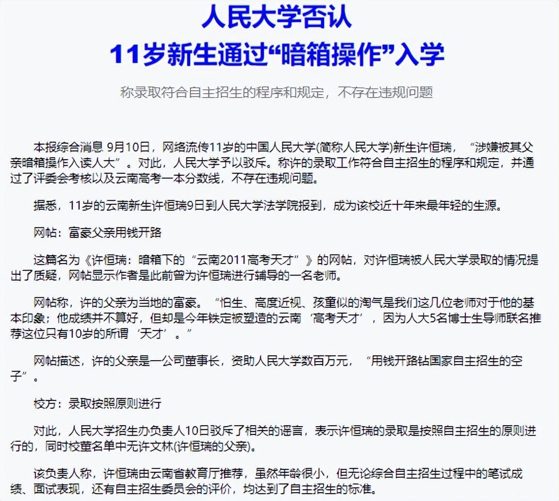 之后,省招生考试院对许恒瑞的高考成绩进行核查,9月15日,核查结果公布,他的高考没有任何问题。所以许恒瑞虽然年纪小,但他是达到自主招生的标准才被录取的,至于许恒瑞的父亲花钱买名额,纯粹是无稽之谈。
