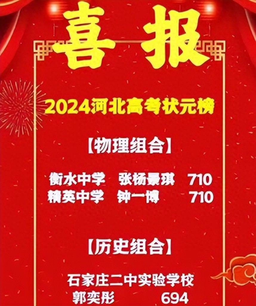 理科状元:钟一博,来自石家庄精英中学,张杨景琪来自衡水中学,2人以710分并列。