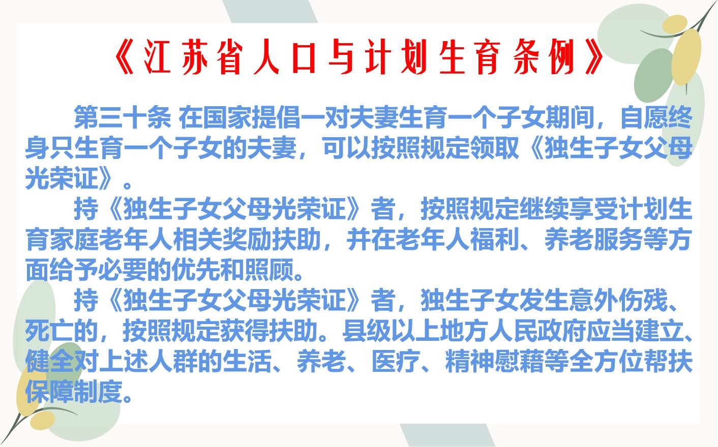 1.江苏省此次修订,规范了独生子女父母奖励和优抚标准。除此以外,还将延长婚假至10天;延长产假不少于30天;延长男职工护理假不少于15天;推动实行父母育儿假制度。相对来说,无论是对独生子女父母,还是年轻夫妻,多事一件好事,为江苏点赞!