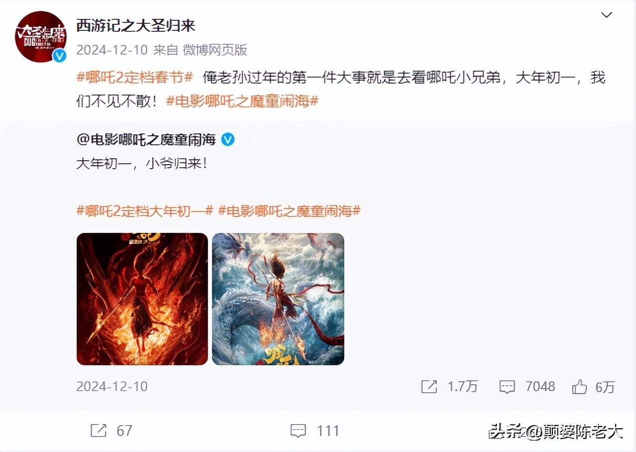 此外,《哪吒》2在定档之后,《大圣归来》也是帮忙做宣传,让大圣和哪吒小小的联动了一下。