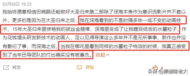 后来电影《深海》不仅给了饺子导演很多灵感,甚至《哪吒》2里面的一些、水墨粒子特效也是借助了田晓鹏导演才实现的。