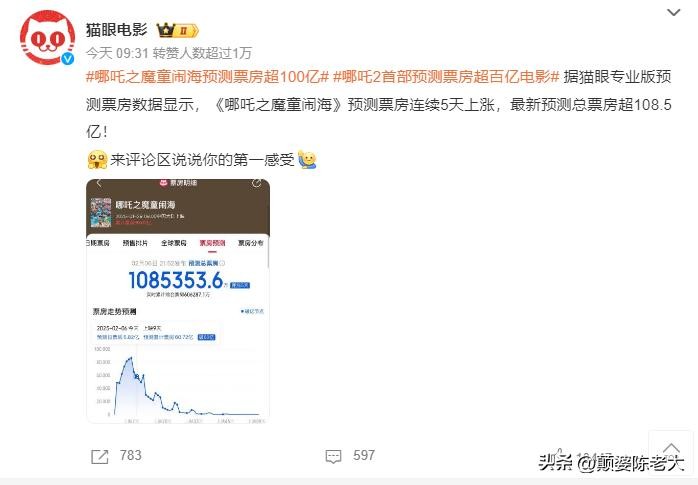 如今随着《哪吒之魔童闹海》票房的不断上涨,猫眼也对其进行了预测,最新预测结果是:总票房将会超过108.5亿。