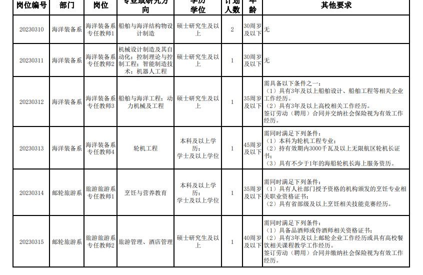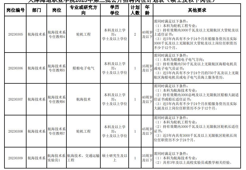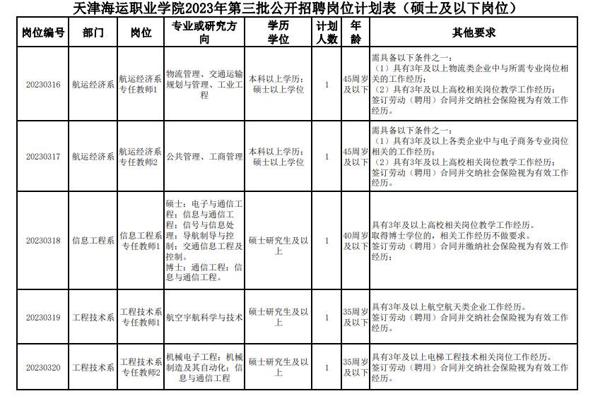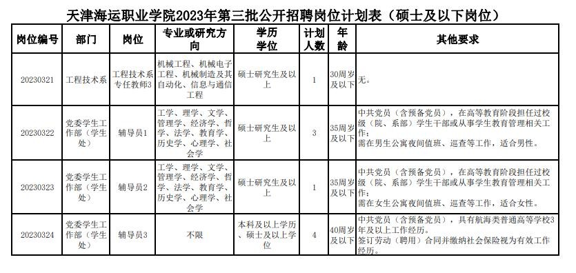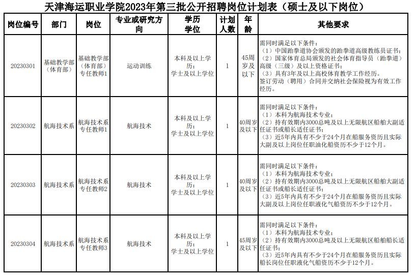 天津海运职业学院2023年第三批公开招聘岗位计划表(硕士及以下岗位)