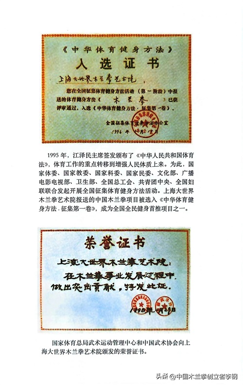 为了更全面把握上海“木兰拳两大传统流派”的动向,卸任前的原国家武术院院长张耀庭又带秘书刘新,在原上海武术院院长毛坤洪先生陪同下,专程到上海大世界听取时任大世界总经理杨启祥和武术竞技中心主任李钢先生对中国木兰拳健身事业发展的专项汇报。接着当年新上任的国家体育总局武术运动管理中心主任兼国家武术院院长李杰先生,也亲自前来上海大世界考察并听取李钢先生的专门汇报。于是便有了1996年中国木兰拳被确立为全民健身首推项目而入选《中华体育健身方法·征集第一卷》;和由国家武术院与上海大世界木兰拳艺术院在北京联合举办首届全国木兰拳教练员、辅导员大型培训班等,为木兰拳在全民健身运动中大力开展打下坚实基础。