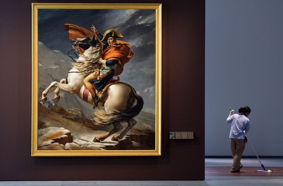 一名清洁工正在名画《拿破仑越过阿尔卑斯山》旁拖地,该画作者是法国艺术家雅克-路易-大卫。摄于2017年11月6日。