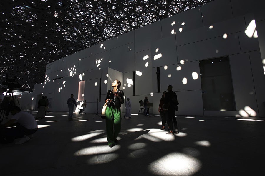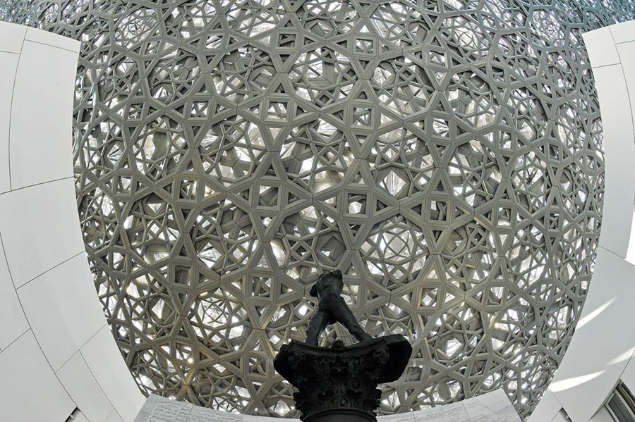 极尽奢华的阿布扎比卢浮宫,于2017年11月11日向公众开放。其顶部是标志性的银色穹顶,几何形的金属格架交相重叠,形成繁复精美的通花样式,阳光映射下,稀疏的阿拉伯几何图形投影在地上,美轮美奂。