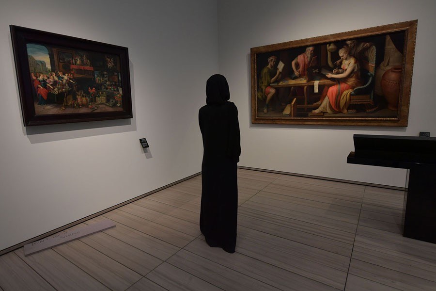 一位女士正在馆内欣赏画作。摄于2017年11月6日,媒体参观。