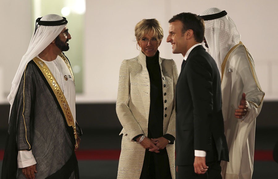 法国总统马克龙与妻子一起参加博物馆揭幕式。左边迎接他们的是迪拜酋长国酋长谢赫-穆罕默德-马克图姆(Sheikh Mohammed bin Rashid Al Maktoum),右边是王储穆罕默德(Mohammed bin Zayed al-Nahayan)。