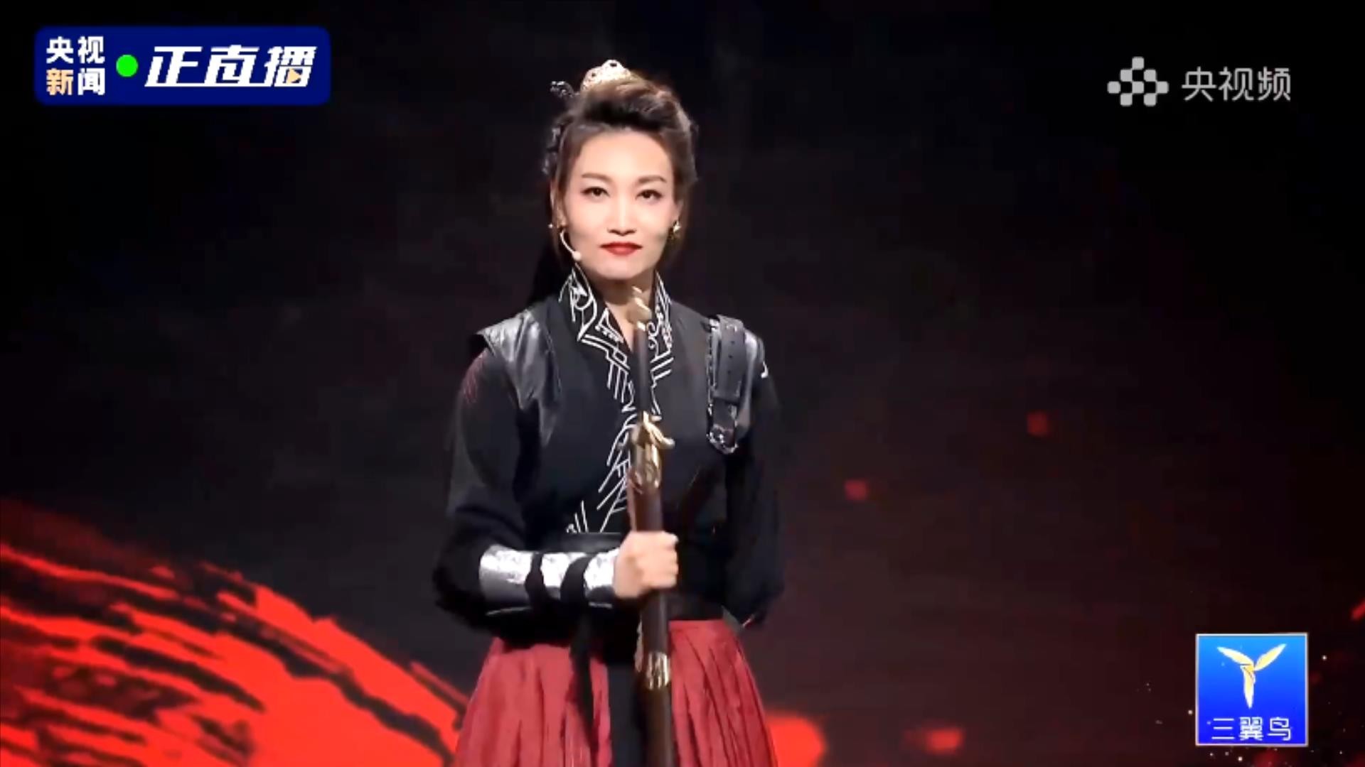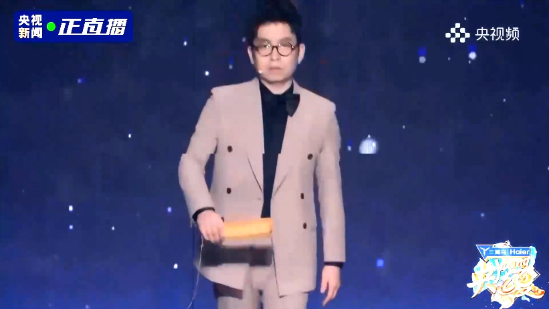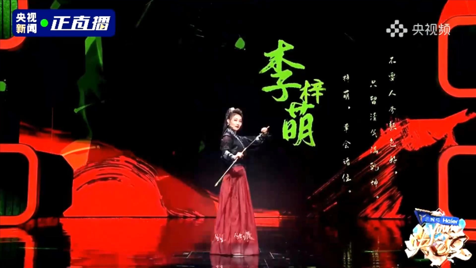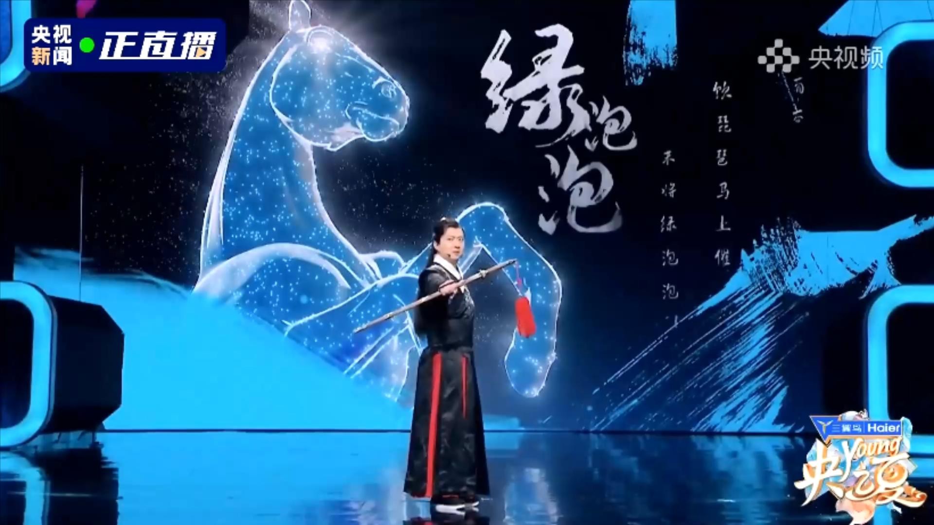 第四位出场的央视主持人,是绿泡泡,他拿了一把剑。