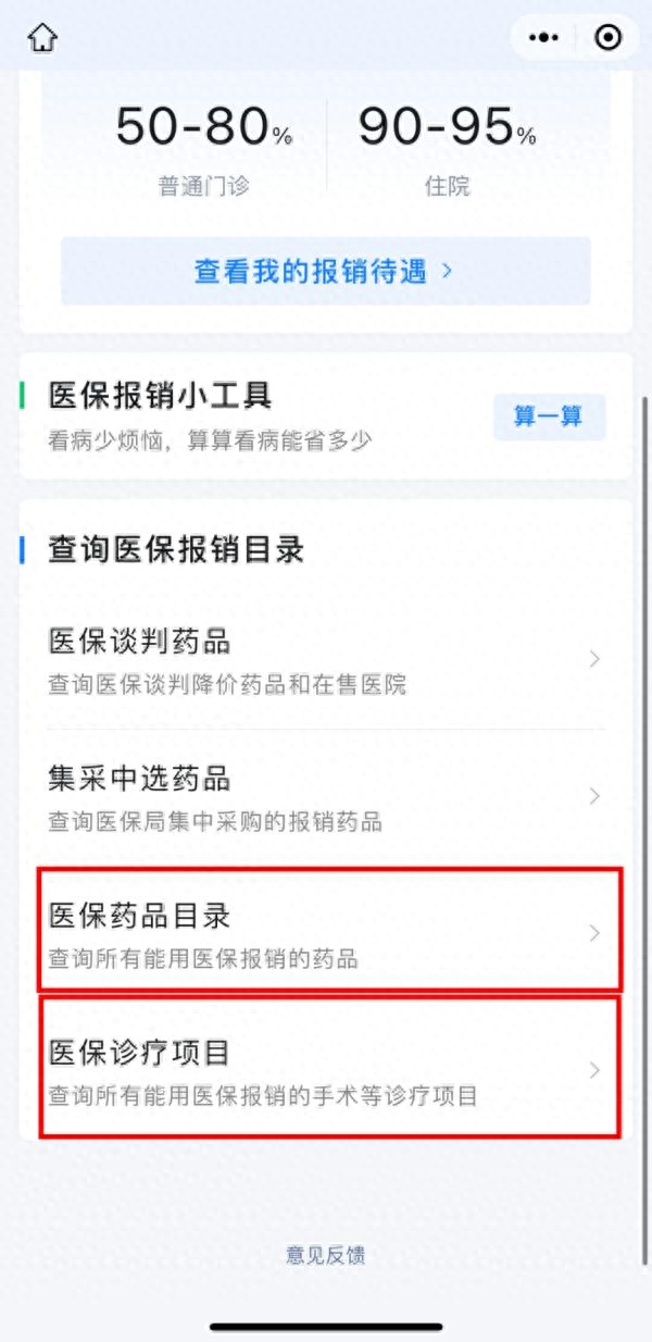 ● 点击“医保报销待遇”,还可查看到所在城市的医保报销目录,什么药能报,比例多少,一清二楚。