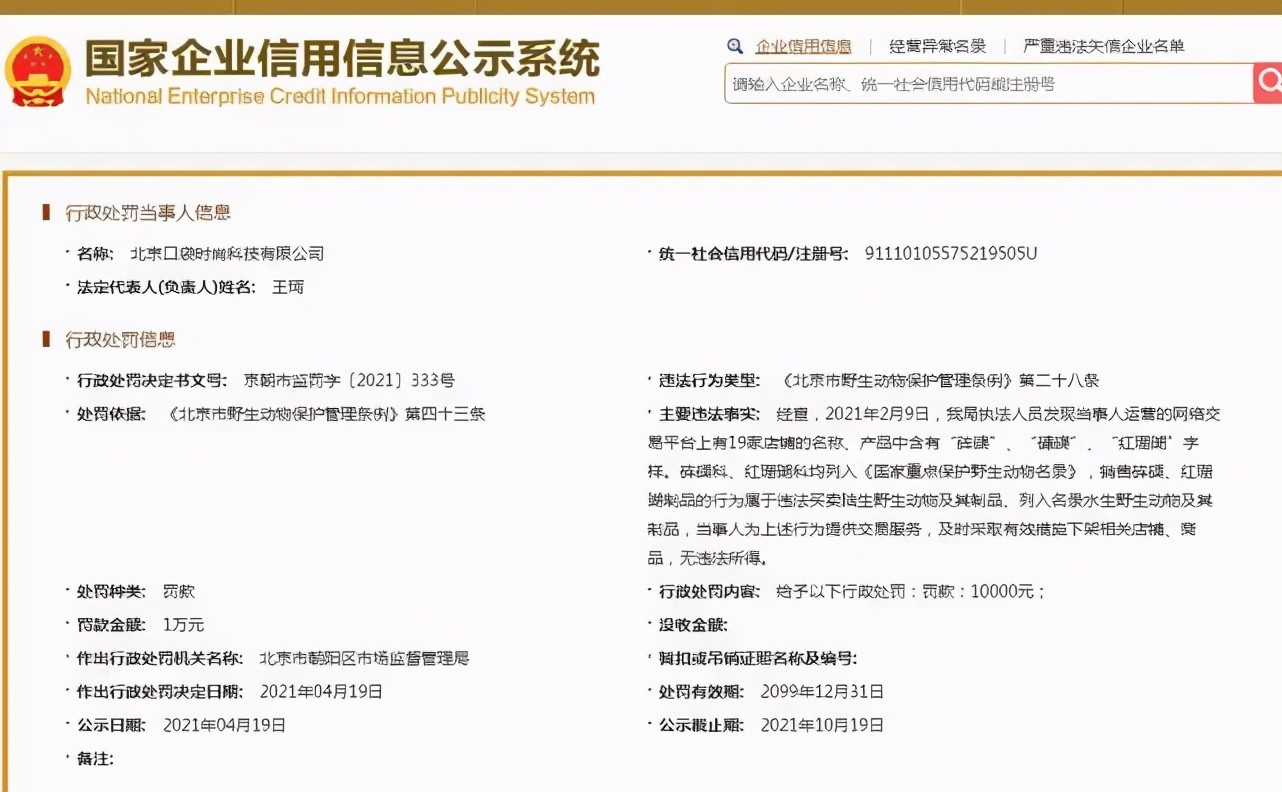 国家企业信用信息公示系统网站截图国家企业信用信息公示系统网站显示,经查,2021年2月9日,北京市朝阳区市场监督管理局执法人员发现北京口袋时尚科技有限公司运营的网络交易平台上有19家店铺的名称、产品中含有“砗磲”“硨磲”“红珊瑚”字样。