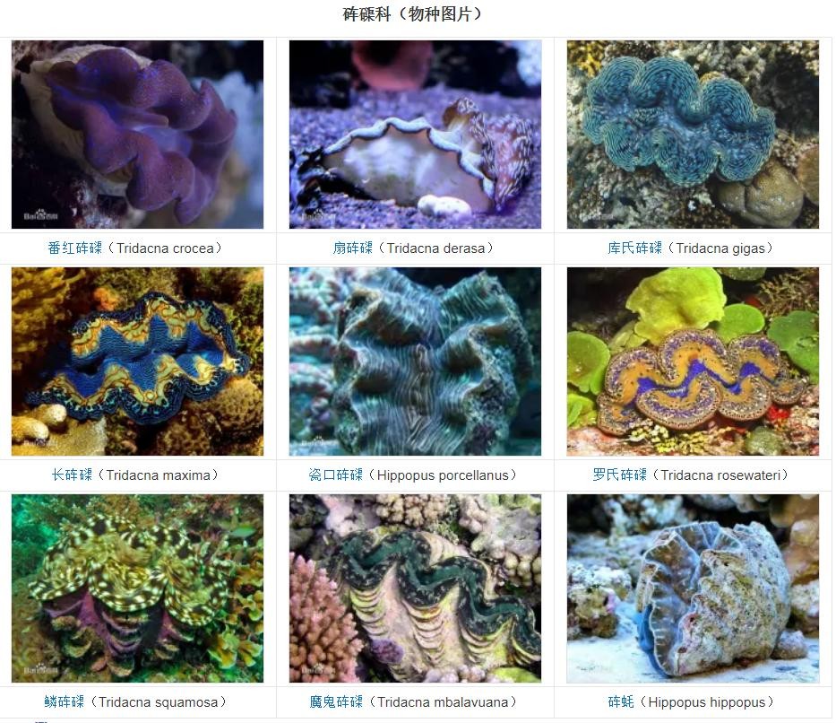 砗磲(学名:Tridacnidae spp.):是软体动物门、双壳纲的海洋动物。共有1科2属9种,是海洋中最大的双壳贝类,被称为“贝王”,最大体长可达1米以上,重量达到300千克以上。