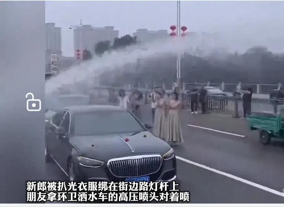 如此婚闹?新郎被裸绑在街头电线杆上 拿环卫洒水车高压喷枪对着喷