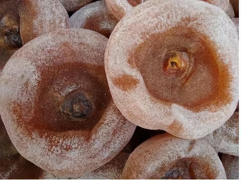 刚刚采摘下来的新鲜柿子保留蒂头,削去表皮。在日光通风条件下,拴在绳子上晾晒,或是放在竹屉里晾晒,晒制柿饼,上霜后即可食用。