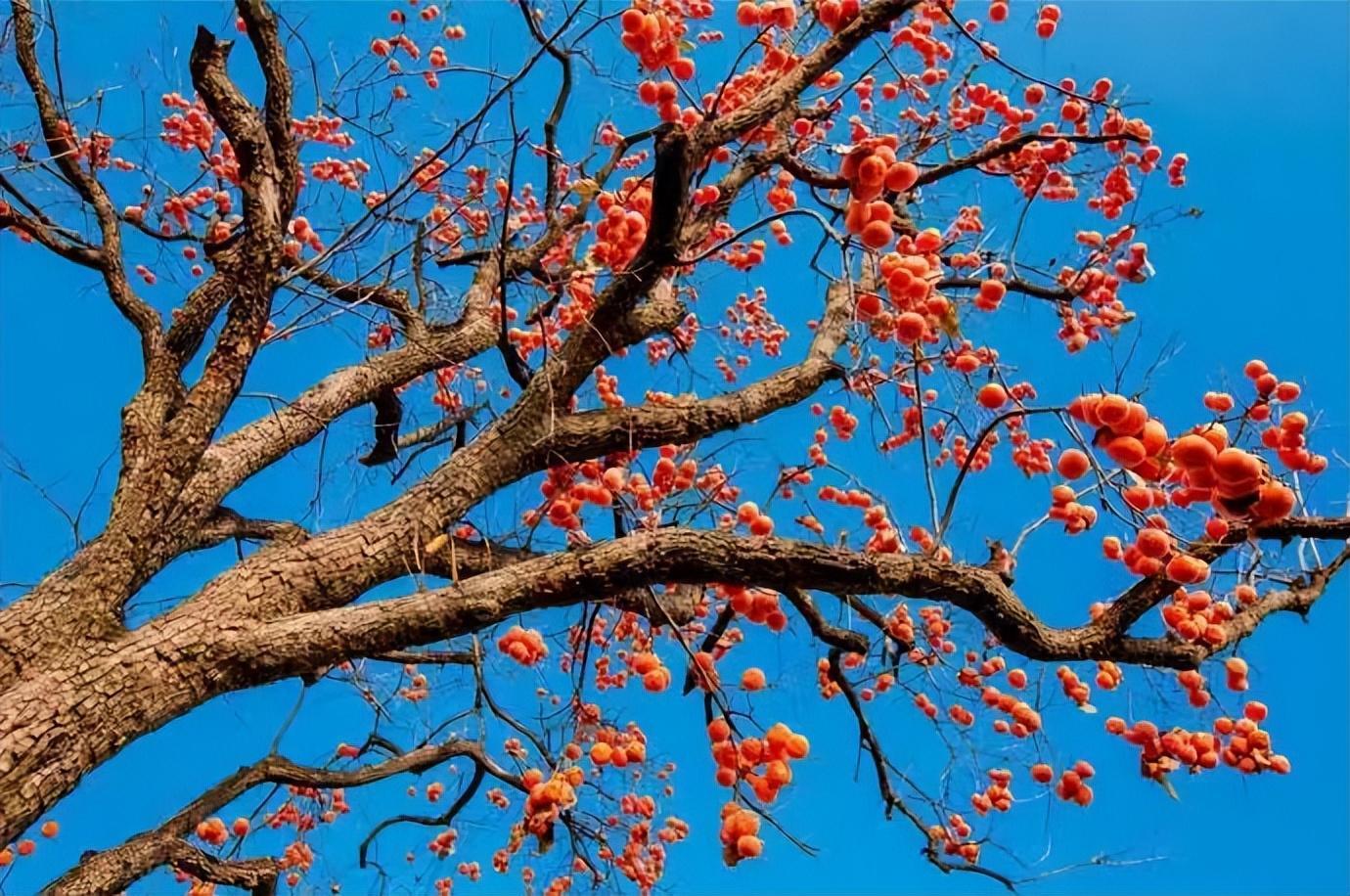 此时,盘曲硬朗的柿树枝干褪去了绿意,着染墨色的枝丫上悬挂着红彤彤的柿子,像是一幅朴素的素描画,又像是油画上色笔触深刻。