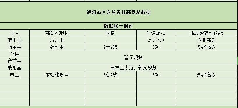濮阳市下辖5个县级单位和城区,目标是规划建设3个高铁站,但是遗憾的是截止目前为止还没有一个高铁站开通使用,不过好在濮阳市有二个高铁站在建设中,这两个在建设的高铁站一个是位于城区的辖区内,另一个则是位于下辖的县级单位南乐县,这两个高铁站都是位于鲁豫二省的主要干线郑济高铁线路上的站点,另外清丰县还规划了一个高铁站,这就是位于濮黄高铁线上的站点,但是遗憾的是范县和台前县二个县级单位既没有高铁站开通使用,也没有规划的高铁站,可以说在很长一段时间内都难以圆上高铁梦,有网友会问高铁新政策下来之后规划的高铁线路会不会夭折?只要是国家主干线或者是省内重要的支线或者是经济受益较大的线路,以上三点只要满足一点都不会夭折的。