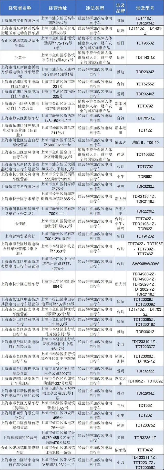 根据上海市安全生产委员会《关于开展电动自行车安全治理攻坚行动的工作方案》要求,市市场监管部门对销售违法电动自行车加强查处力度,现将今年以来市市场监管部门作出行政处罚的 37 家违法电动自行车经营者及产品信息公布如下: