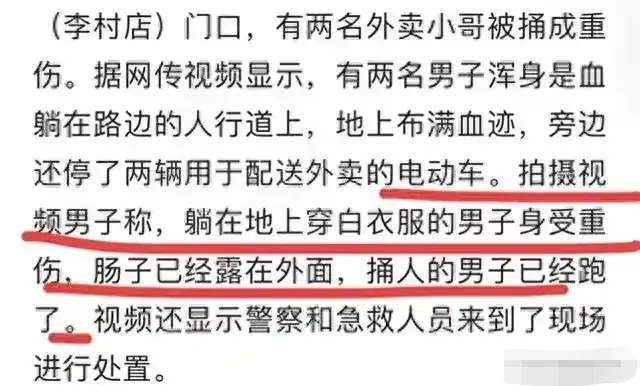 事件发生后,警方和医疗人员迅速赶到现场进行处置。受伤的外卖小哥被紧急送往附近医院进行救治。据医院方面透露,其中一名外卖员伤势较重,肠子都露了出来,正在全力抢救。目前,凶手已被警方控制,案件正在进一步调查中。