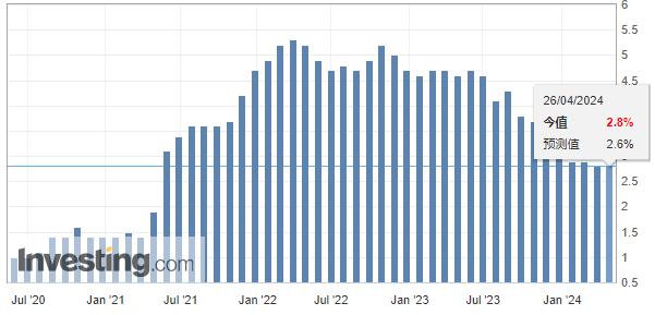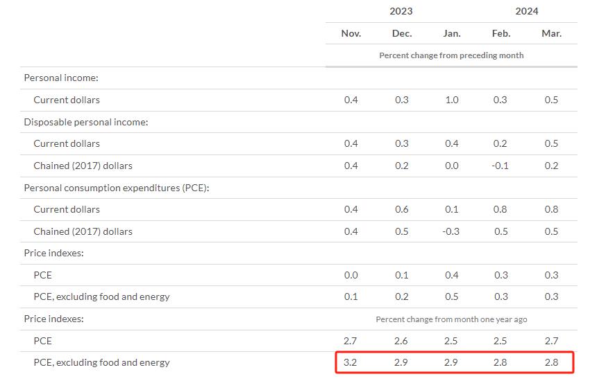 剔除能源和食品价格后,核心 PCE 价格指数环比增长 0.3%,也与预期一致;同比增幅录得 2.8%,与 2 月相比没有变化,市场原先预计会放缓至 2.7%。