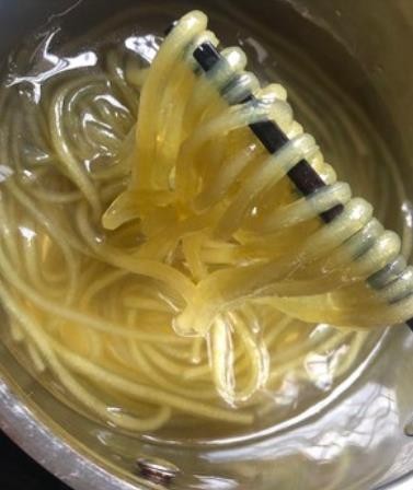 一般家中都会准备好各种的粉,有干粉丝、干面条、干红薯粉等,大家不想做饭的话就可以下粉吃。红薯粉一般比较的粗,所以在用水煮的时候,时间要稍微长一点,看到里面没有硬芯时差不多就熟了,这时候就将它捞出来,放入凉白开水中冷却备用。