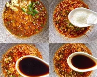 准备一个小碗,这时候我们要开始调各种的酱汁了,往里面加入一勺熟白芝麻、两勺辣椒粉、一勺葱花、两勺蒜末,再加上小米辣椒,搅拌均匀。起锅烧油,油热之后即可关火,再将热油淋入碗中,再加入半勺白糖、半勺盐、半勺老抽、两勺生抽、两勺陈醋以及半碗凉白开水,搅拌均匀,这样我们的料汁就准备好了。