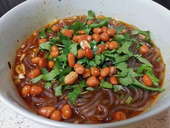 将煮好的红薯粉捞出来,放入装有料汁的碗中,然后再加入熟花生以及香菜,如果有肉的话,也可以放一点进去,搅拌均匀,这样一碗酸辣爽口的酸辣红薯粉就制作好了。