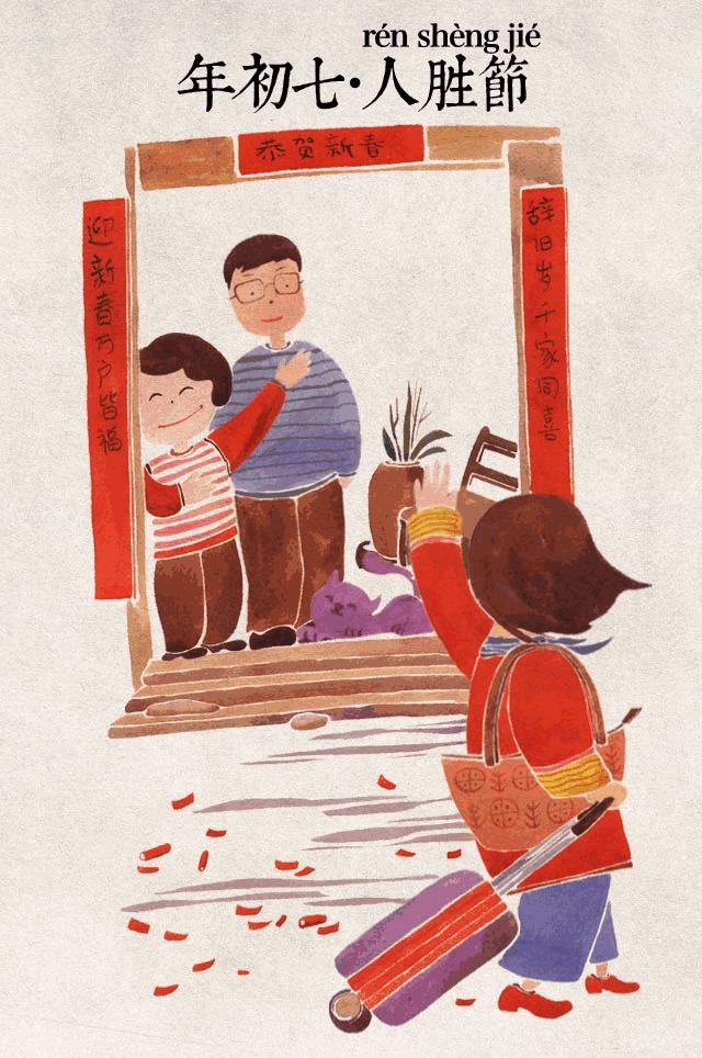年初七,又称“人日”。民俗专家说,在中国至少史长两千年。民间传说女娲造人之时,正月前六天分别造了鸡、狗、羊、猪、牛、马,第七日造出了人,因此正月初七这天是人类的生日。
